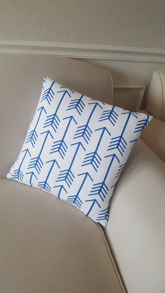Modern White with Cobalt Blue Arrows Decorative Indoor Pillow Cover with zipper opening.